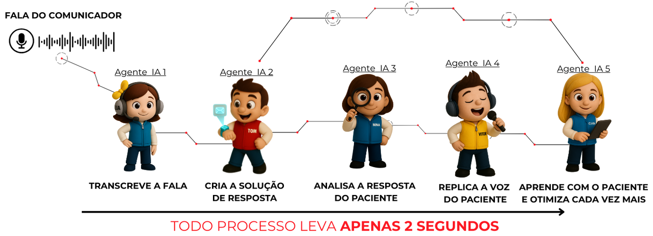 Tudo isso acontece em poucos segundos, criando um fluxo de comunicação natural, rápido e sem sofrimento.