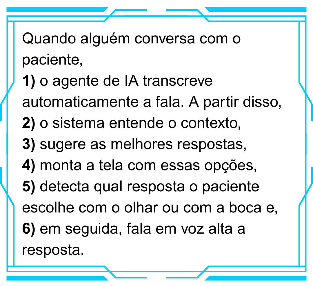 Você conversa normalmente com a pessoa com ELA. O sistema escuta a pergunta, gera opções de resposta na tela, capta o olhar ou a boca do paciente e responde por ele em voz alta. Tudo isso acontece com a ajuda de múltiplos agentes de inteligência artificial, em questão de segundos.