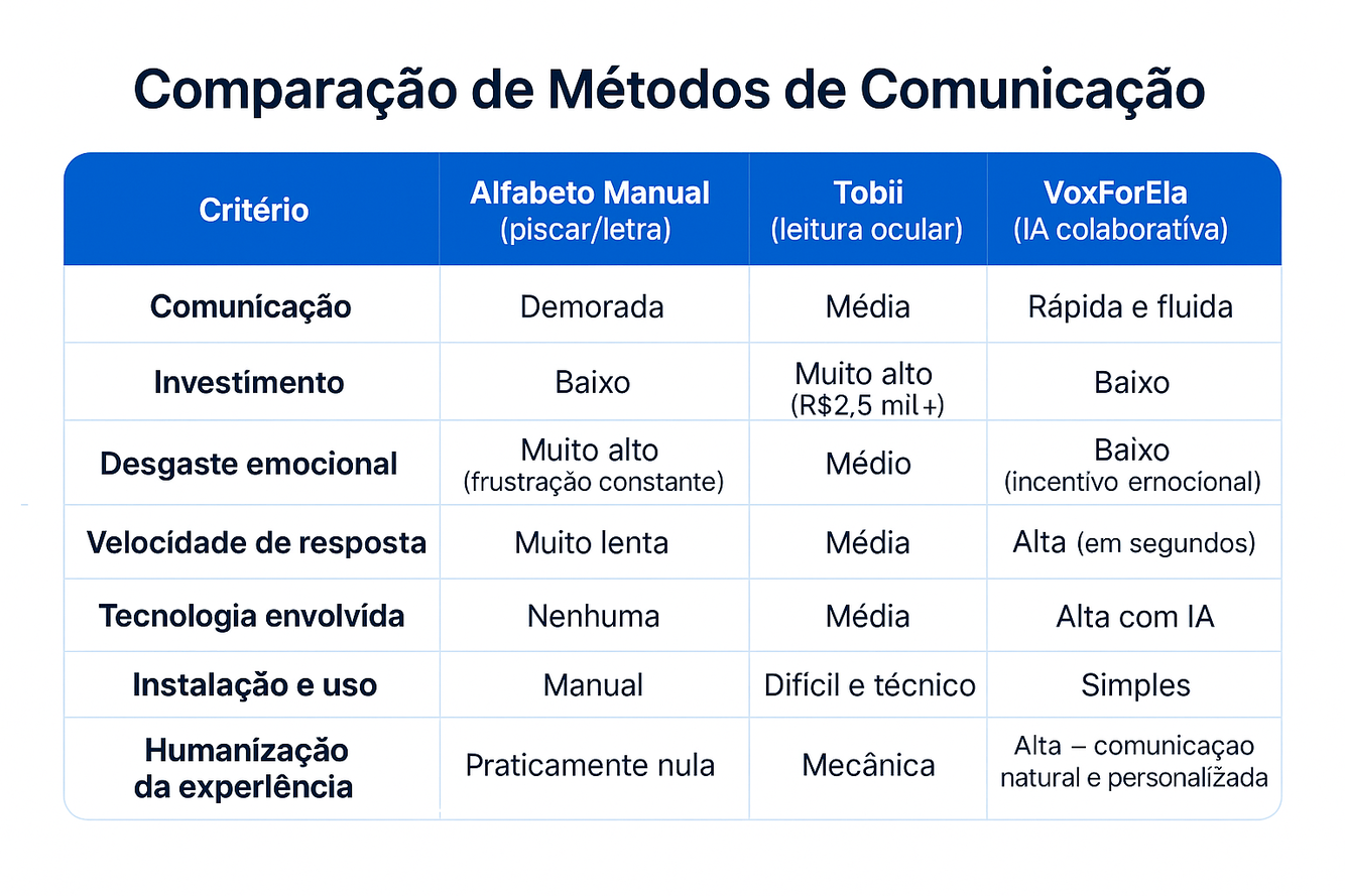 Hoje, muitas famílias ainda utilizam métodos manuais, como uma folha de papel com o alfabeto, onde o cuidador aponta letra por letra e o paciente pisca ao identificar a letra desejada para formar as frases. Esse processo torna a comunicação extremamente lenta e cansativa.